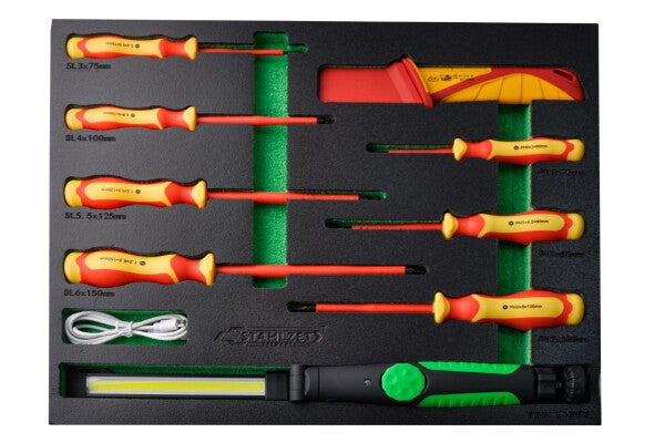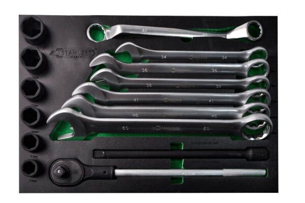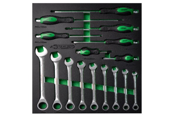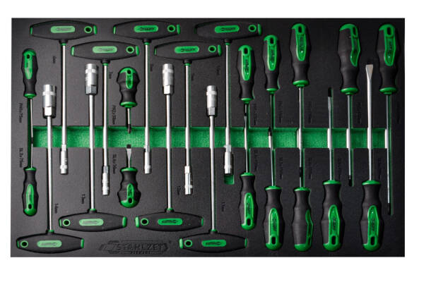 Alle gereedschappen zijn veilig opgeborgen in stevige modules en intuïtief geordend. Dankzij de schuimrubberen inlays kunt u in één oogopslag zien of alle gereedschappen op hun plek liggen. De robuuste zwenkwielen, waarvan er twee met rem, en de stevige handgreep maken het eenvoudig om de wagen te verplaatsen. Voor extra veiligheid kunnen de lades met een cilinderslot en twee sleutels worden vergrendeld.