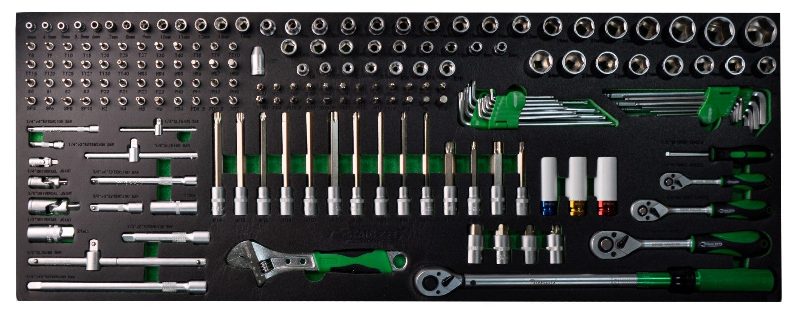 - Schuifstangen: 3 stuks (1/4”, 3/8”, 1/2” aandrijving)